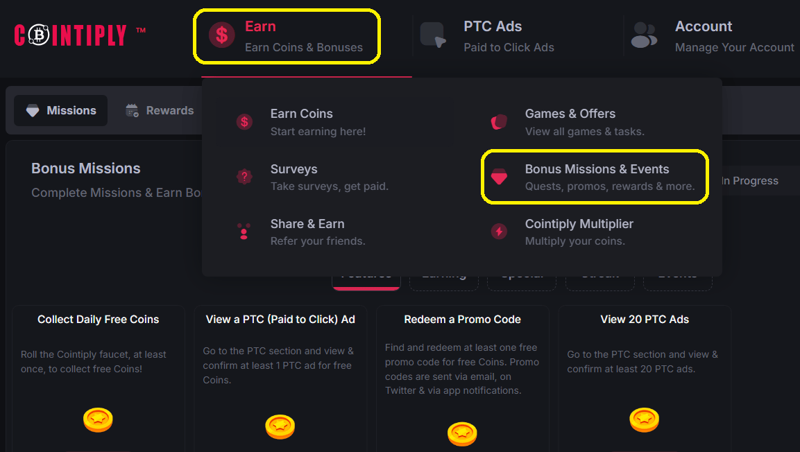 No primeiro acesso já podes começar a ganhar. A maioria das áreas para ganhar estão no menu "Earn".