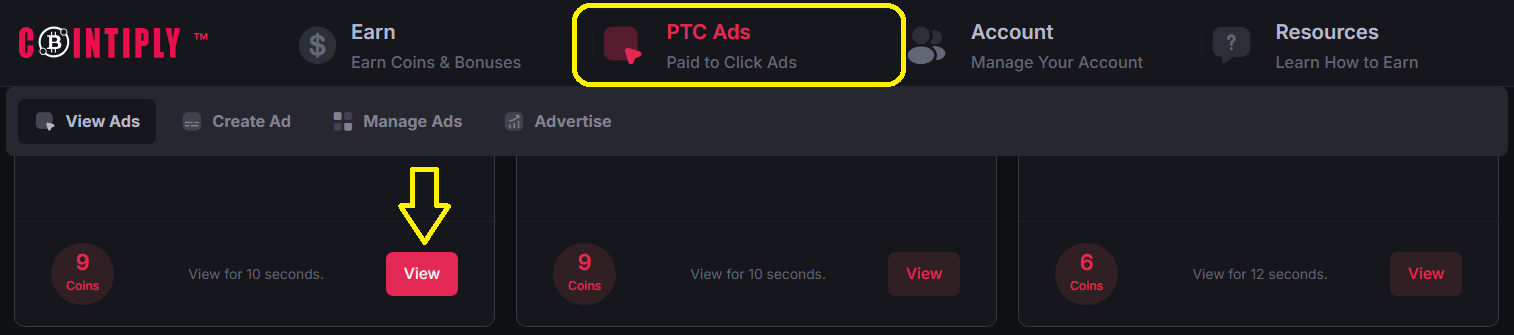 • GANHAR POR CLIQUES: Começa por "PTC Ads", onde podes ganhar a clicar em diversos anúncios. É só abrir a aba "PTC Ads" e depois clicar em "View" em cada anúncio, e aguardar alguns segundos até terminar o temporizador.