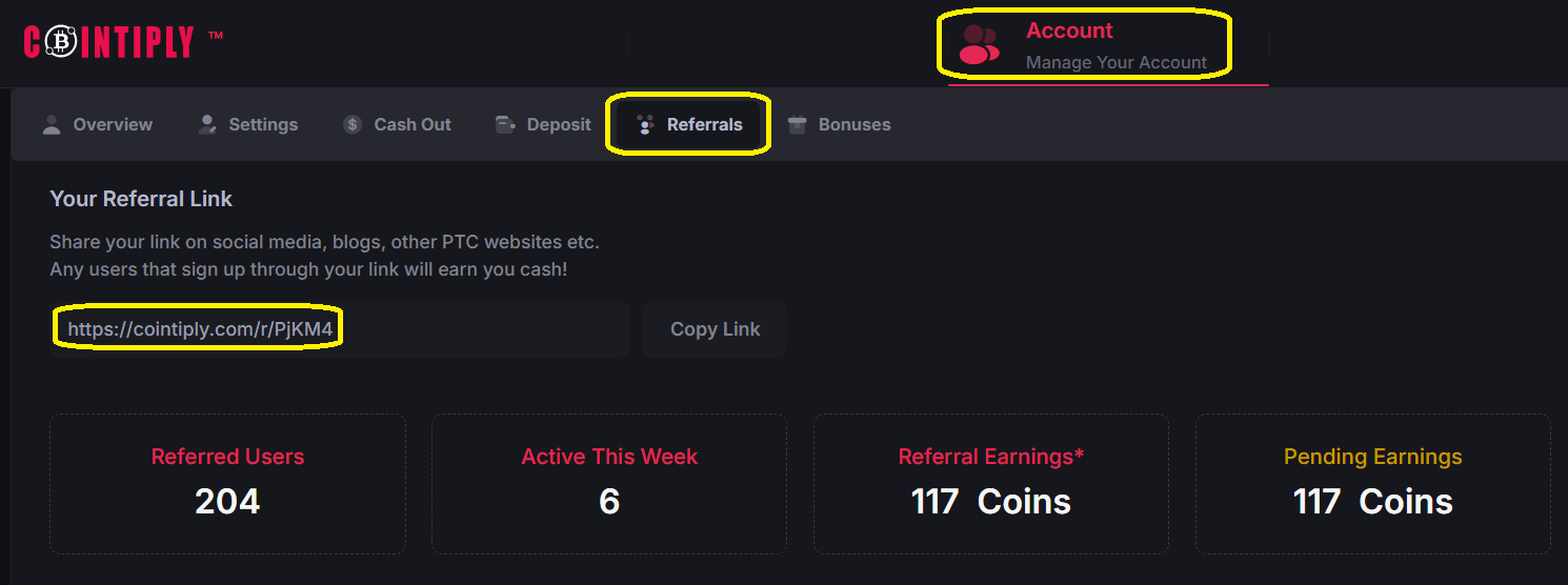 Para obter o teu link de angariação, e ver as estatísticas dos teus referidos, entra no menu "Account" e depois no separador "Referrals". Aí vais poder visualizar algumas estatísticas dos teus referidos, e obter o teu link para enviar para os teus amigos.